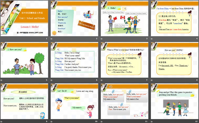关键词:冀教版七年级上册英语PPT课件免费下载,Hello!PPT下载,School and FriendsPPT下载,.PPT格式;