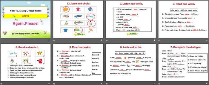 关键词:冀教版六年级下册英语PPT课件免费下载,Again,Please!PPT下载,Li Ming Comes HomePPT下载,.PPT格式;
