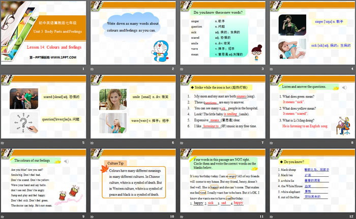 关键词:冀教版七年级上册英语PPT课件免费下载,Colours and FeelingsPPT下载,Body Parts and FeelingsPPT下载,.PPT格式;