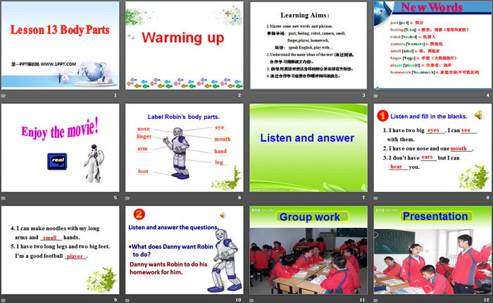掌握单词:part, feeling, robot, camera, smell,finger,player, homework,