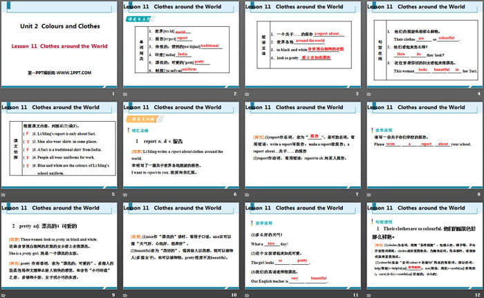 关键词:冀教版七年级上册英语PPT课件免费下载,Clothes around the WorldPPT下载,Colours and ClothesPPT下载,.PPT格式;