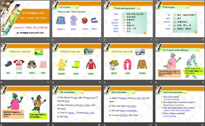 关键词:冀教版七年级上册英语PPT课件免费下载,Clothes for a Cold DayPPT下载,Colours and ClothesPPT下载,.PPT格式;