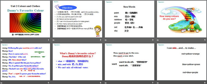 关键词:冀教版七年级上册英语PPT课件免费下载,Danny's Favourite ColourPPT下载,Colours and ClothesPPT下载,.PPT格式;