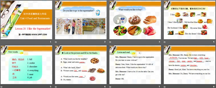关键词:冀教版七年级上册英语PPT课件免费下载,I like the Supermarket!PPT下载,Food and RestaurantsPPT下载,.PPT格式;