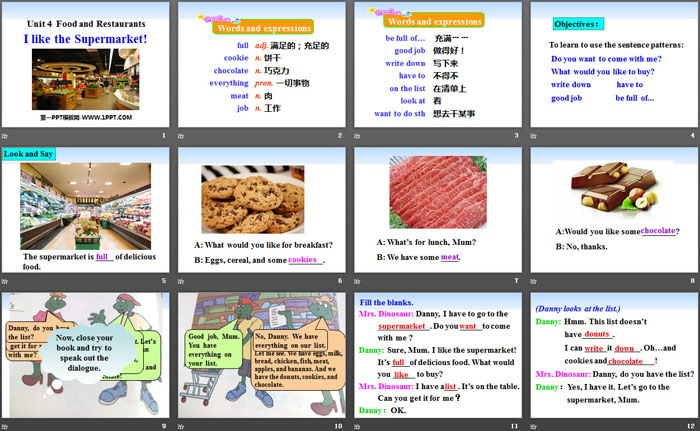 关键词:冀教版七年级上册英语PPT课件免费下载,I like the Supermarket!PPT下载,Food and RestaurantsPPT下载,.PPT格式;