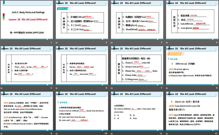 关键词:冀教版七年级上册英语PPT课件免费下载,We All Look Different!PPT下载,Body Parts and FeelingsPPT下载,.PPT格式;