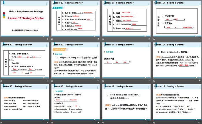 关键词:冀教版七年级上册英语PPT课件免费下载,Seeing a DoctorPPT下载,Body Parts and FeelingsPPT下载,.PPT格式;
