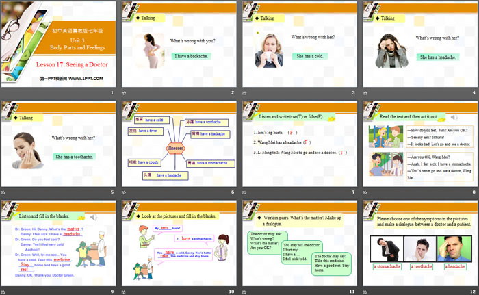 关键词:冀教版七年级上册英语PPT课件免费下载,Seeing a DoctorPPT下载,Body Parts and FeelingsPPT下载,.PPT格式;