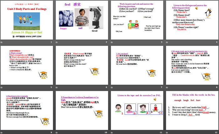 关键词:冀教版七年级上册英语PPT课件免费下载,Happy or SadPPT下载,Body Parts and FeelingsPPT下载,.PPT格式;