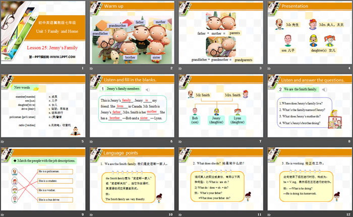 关键词:冀教版七年级上册英语PPT课件免费下载,Jenny's FamilyPPT下载,Family and HomePPT下载,.PPT格式;