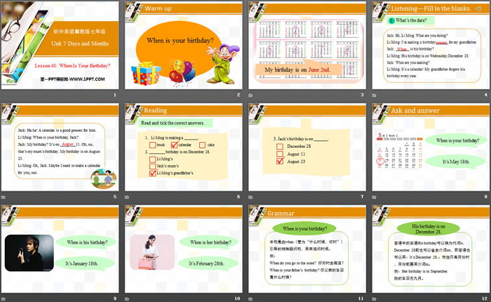 关键词:冀教版七年级上册英语PPT课件免费下载,When Is Your Birthday?PPT下载,Days and MonthsPPT下载,.PPT格式;