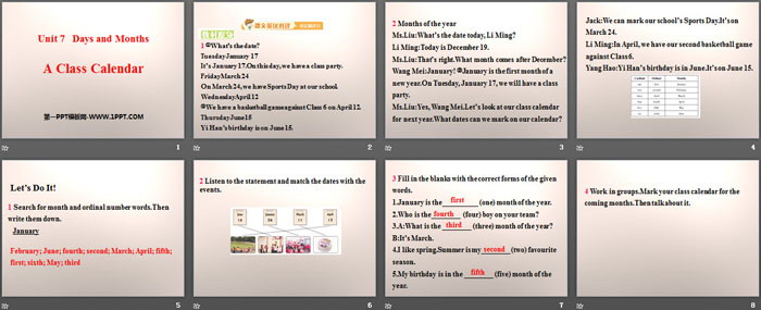 关键词:冀教版七年级上册英语PPT课件免费下载,A Class CalendarPPT下载,Days and MonthsPPT下载,.PPT格式;