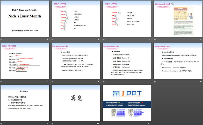 关键词:冀教版七年级上册英语PPT课件免费下载,Nick's Busy MonthPPT下载,Days and MonthsPPT下载,.PPT格式;