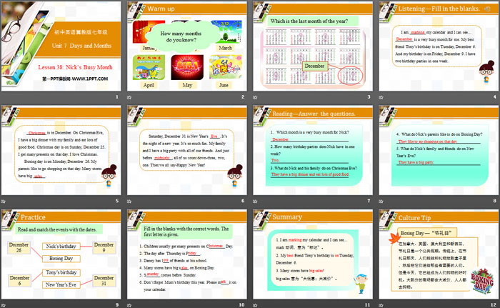 关键词:冀教版七年级上册英语PPT课件免费下载,Nick's Busy MonthPPT下载,Days and MonthsPPT下载,.PPT格式;