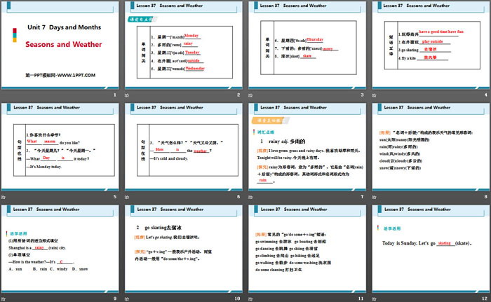 关键词:冀教版七年级上册英语PPT课件免费下载,Seasons and WeatherPPT下载,Days and MonthsPPT下载,.PPT格式;