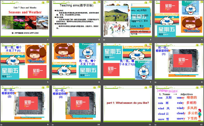 关键词:冀教版七年级上册英语PPT课件免费下载,Seasons and WeatherPPT下载,Days and MonthsPPT下载,.PPT格式;