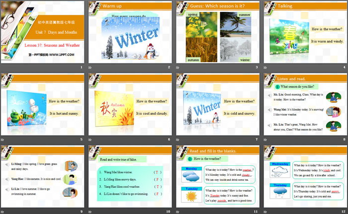 关键词:冀教版七年级上册英语PPT课件免费下载,Seasons and WeatherPPT下载,Days and MonthsPPT下载,.PPT格式;
