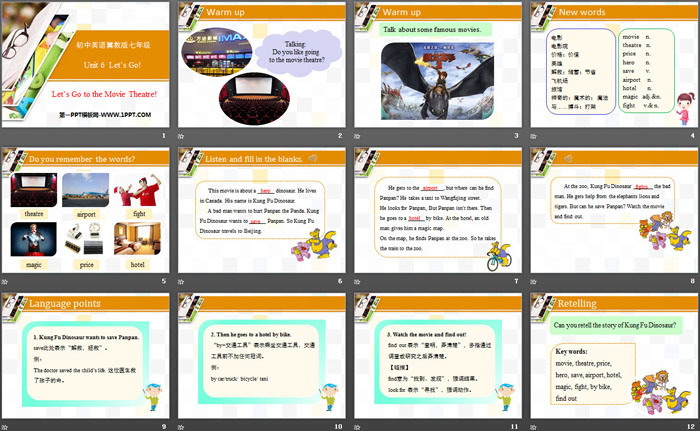 关键词:冀教版七年级上册英语PPT课件免费下载,Let's Go to the Movie Theatre!PPT下载,Let's Go!PPT下载,.PPT格式;
