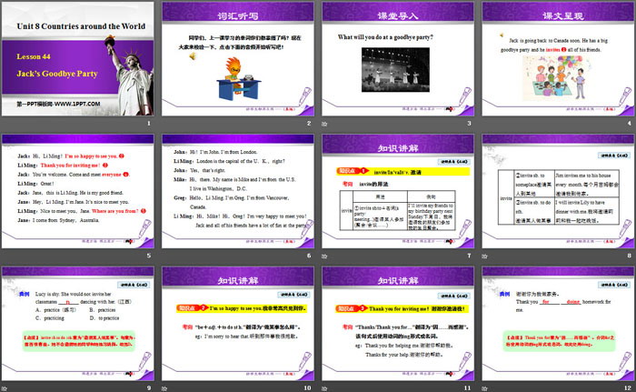 关键词:冀教版七年级上册英语PPT课件免费下载,Jack's Goodbye PartyPPT下载,Countries around the WorldPPT下载,.PPT格式;