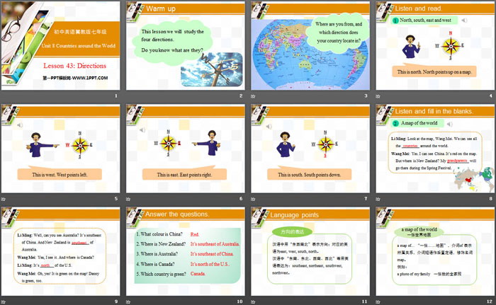 关键词:冀教版七年级上册英语PPT课件免费下载,DirectionsPPT下载,Countries around the WorldPPT下载,.PPT格式;