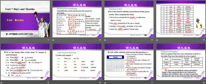 关键词:冀教版七年级上册英语PPT课件免费下载,ReviewPPT下载,Days and MonthsPPT下载,.PPT格式;