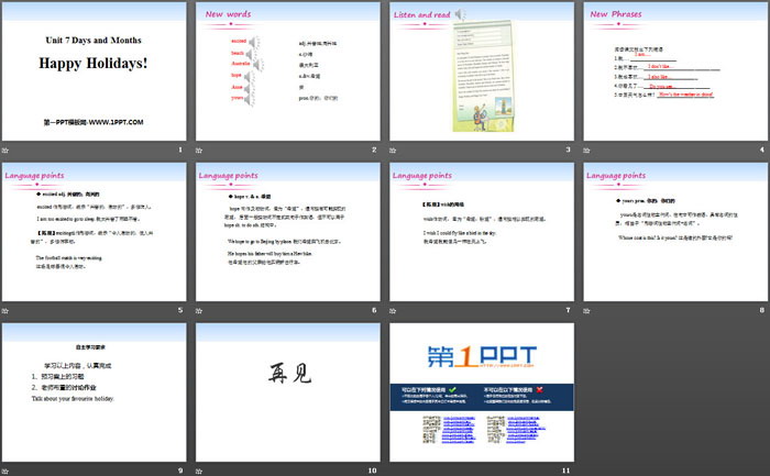 关键词:冀教版七年级上册英语PPT课件免费下载,Happy Holidays!PPT下载,Days and MonthsPPT下载,.PPT格式;