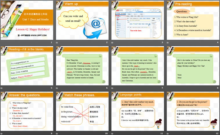 关键词:冀教版七年级上册英语PPT课件免费下载,Happy Holidays!PPT下载,Days and MonthsPPT下载,.PPT格式;