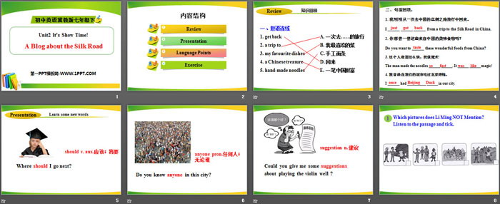 关键词:冀教版七年级下册英语PPT课件免费下载,A Blog about the Silk RoadPPT下载,It's Show Time!PPT下载,.PPT格式;