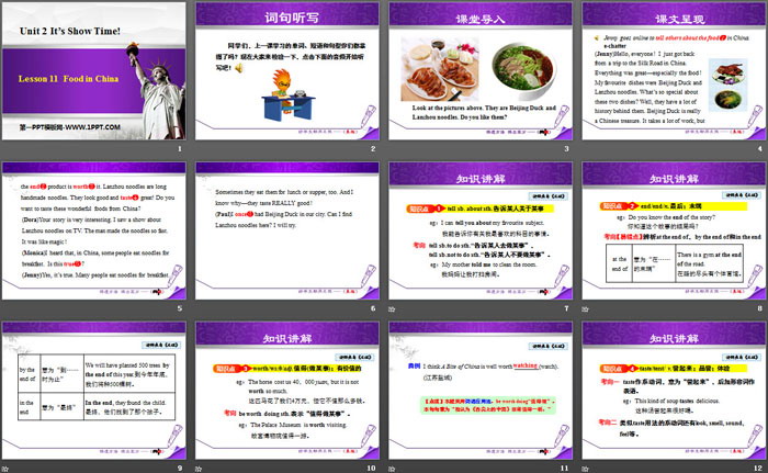关键词:冀教版七年级下册英语PPT课件免费下载,Food in ChinaPPT下载,It's Show Time!PPT下载,.PPT格式;