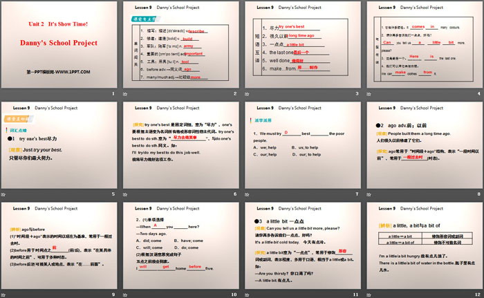 关键词:冀教版七年级下册英语PPT课件免费下载,Danny's School ProjectPPT下载,It's Show Time!PPT下载,.PPT格式;