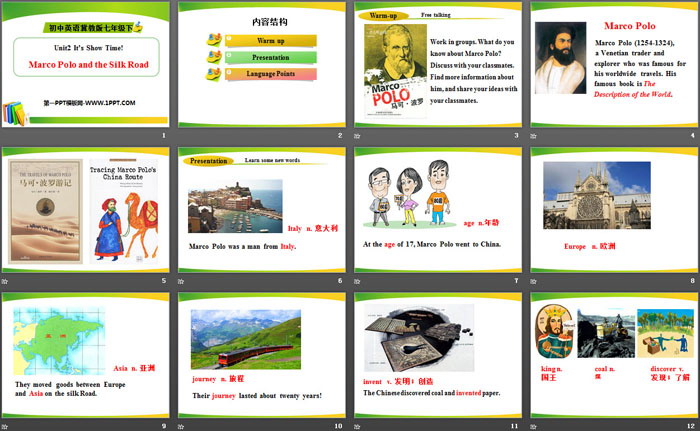 关键词:冀教版七年级下册英语PPT课件免费下载,Marco Polo and the Silk RoadPPT下载,It's Show Time!PPT下载,.PPT格式;