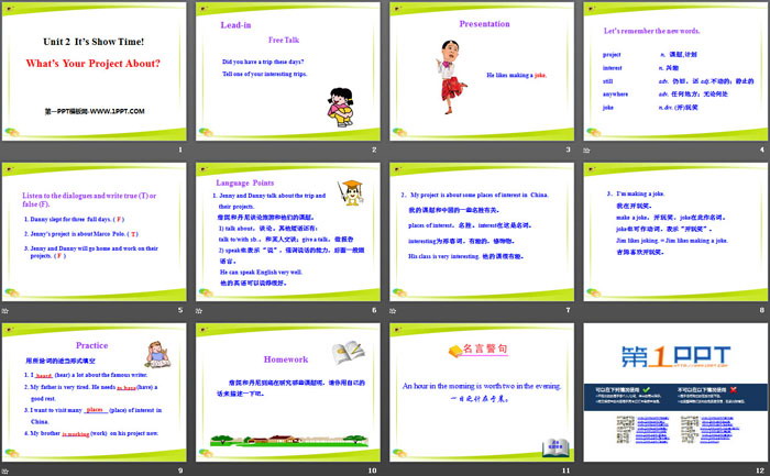 关键词:冀教版七年级下册英语PPT课件免费下载,What's Your Project About?PPT下载,It's Show Time!PPT下载,.PPT格式;