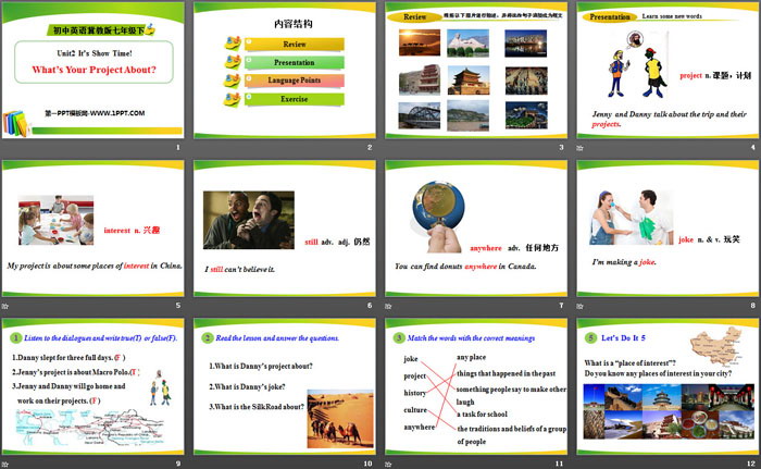 关键词:冀教版七年级下册英语PPT课件免费下载,What's Your Project About?PPT下载,It's Show Time!PPT下载,.PPT格式;