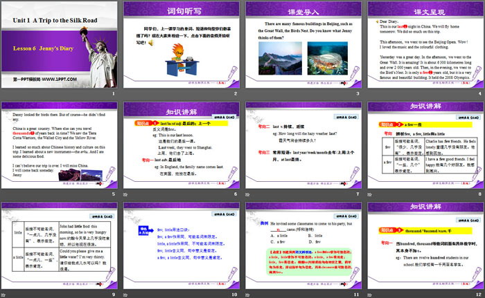 关键词:冀教版七年级下册英语PPT课件免费下载,Jenny's DiaryPPT下载,A Trip to the Silk RoadPPT下载,.PPT格式;