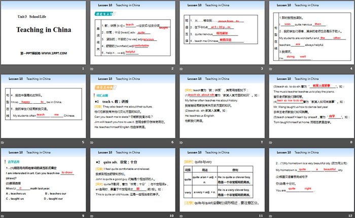 关键词:冀教版七年级下册英语PPT课件免费下载,Teaching in ChinaPPT下载,School LifePPT下载,.PPT格式;