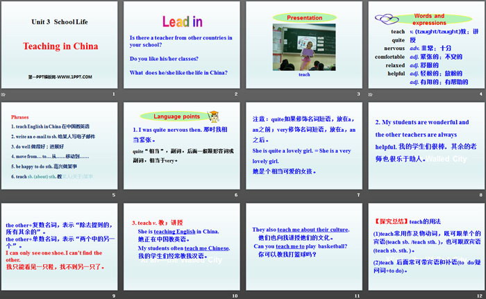关键词:冀教版七年级下册英语PPT课件免费下载,Teaching in ChinaPPT下载,School LifePPT下载,.PPT格式;