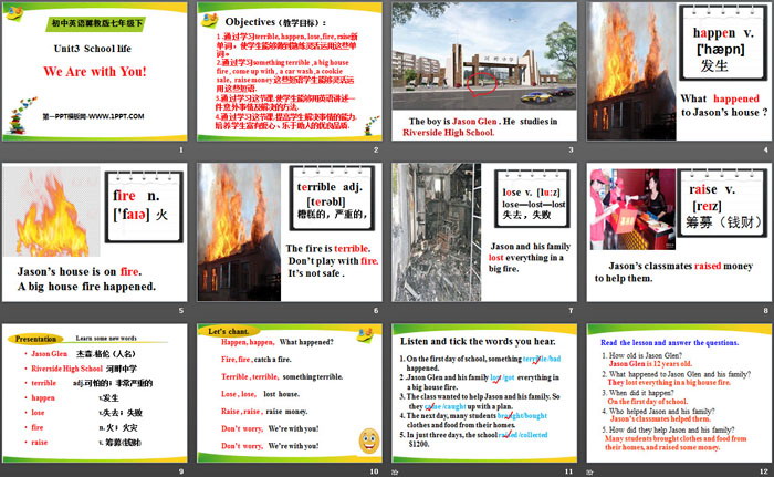 关键词:冀教版七年级下册英语PPT课件免费下载,We Are with You!PPT下载,School LifePPT下载,.PPT格式;