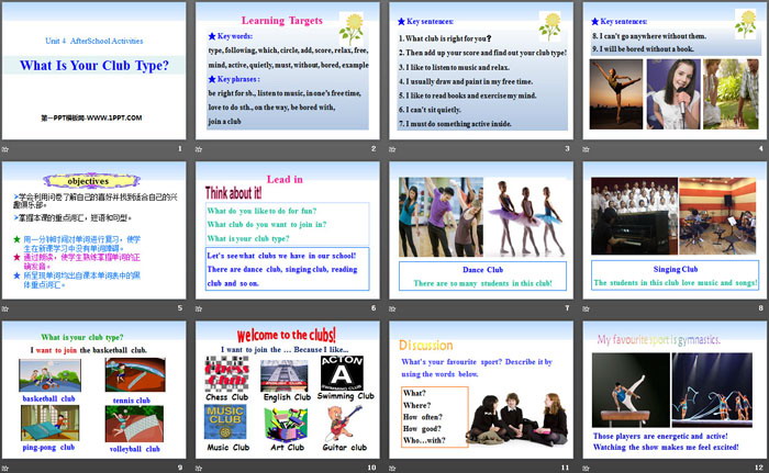 关键词:冀教版七年级下册英语PPT课件免费下载,What Is Your Club Type?PPT下载,After-School ActivitiesPPT下载,.PPT格式;