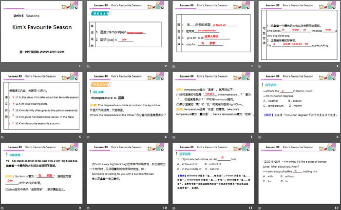 关键词:冀教版七年级下册英语PPT课件免费下载,Kim's Favourite SeasonPPT下载,SeasonsPPT下载,.PPT格式;