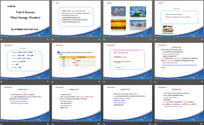 关键词:冀教版七年级下册英语PPT课件免费下载,What Strange Weather!PPT下载,SeasonsPPT下载,.PPT格式;