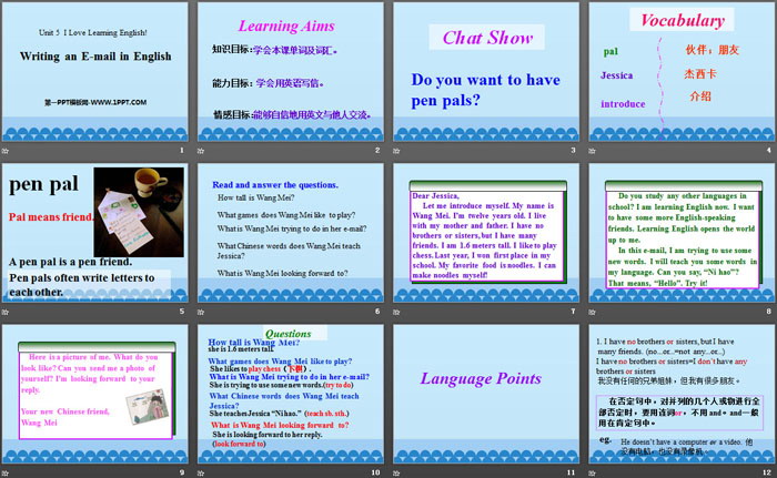 关键词:冀教版七年级下册英语PPT课件免费下载,Writing an E-mail in EnglishPPT下载,I Love Learning EnglishPPT下载,.PPT格式;