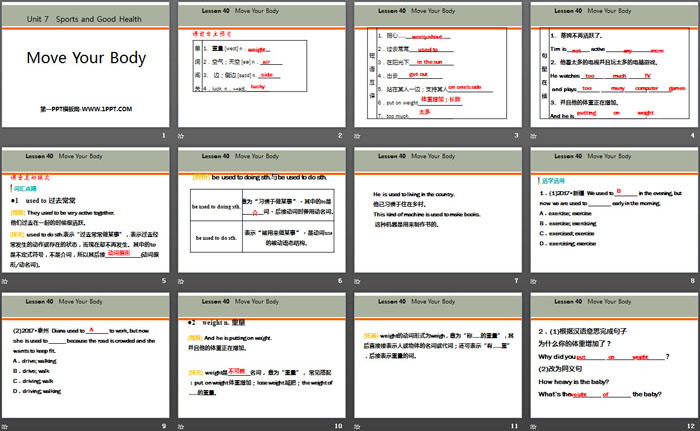 关键词:冀教版七年级下册英语PPT课件免费下载,Move Your BodyPPT下载,Sports and Good HealthPPT下载,.PPT格式;
