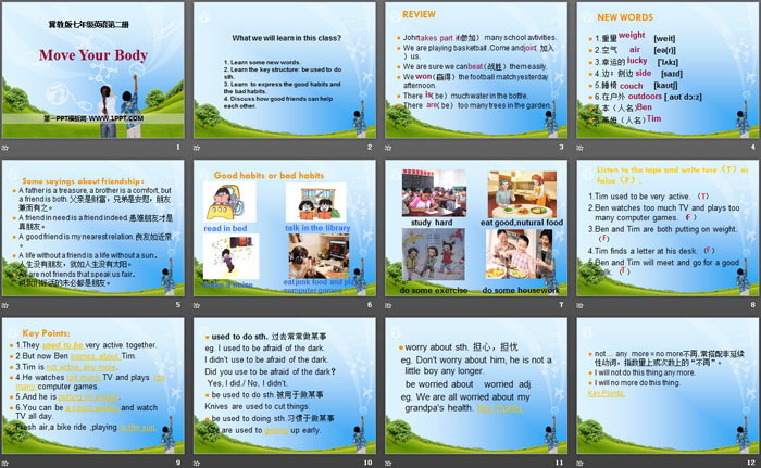 关键词:冀教版七年级下册英语PPT课件免费下载,Move Your BodyPPT下载,Sports and Good HealthPPT下载,.PPT格式;