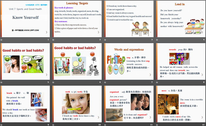 1. Learned some new words and phrases: step, towards, brush, tooth, organized, mess, develop, work for, write down, improve myself, brush one's teeth, make one's bed, lead the way to, work on