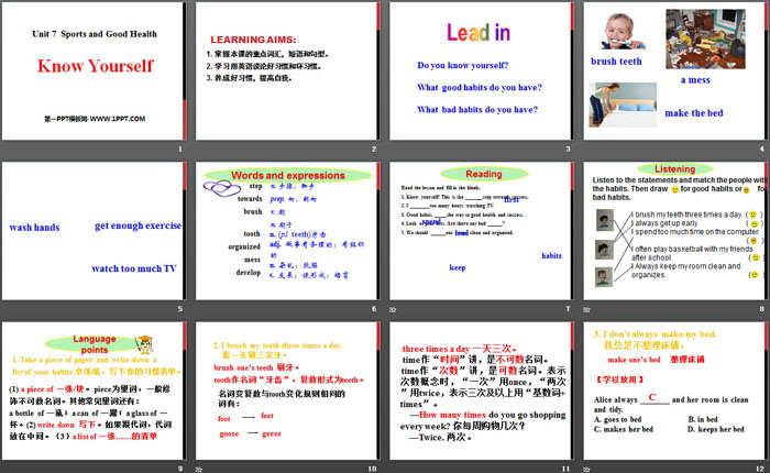 关键词:冀教版七年级下册英语PPT课件免费下载,Know YourselfPPT下载,Sports and Good HealthPPT下载,.PPT格式;