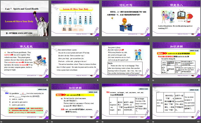 关键词:冀教版七年级下册英语PPT课件免费下载,Move Your BodyPPT下载,Sports and Good HealthPPT下载,.PPT格式;