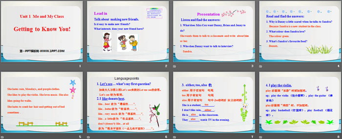 关键词:冀教版八年级上册英语PPT课件免费下载,Getting to know youPPT下载,Me and My ClassPPT下载,.PPT格式;