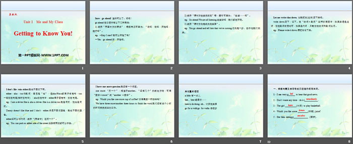 关键词:冀教版八年级上册英语PPT课件免费下载,Getting to know youPPT下载,Me and My ClassPPT下载,.PPT格式;