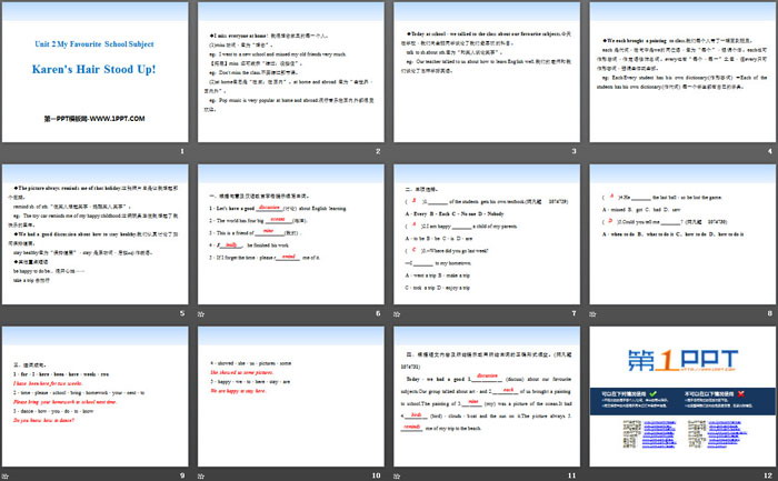 关键词:冀教版八年级上册英语PPT课件免费下载,Karen's Hair Stood Up!PPT下载,My Favourite School SubjectPPT下载,.PPT格式;