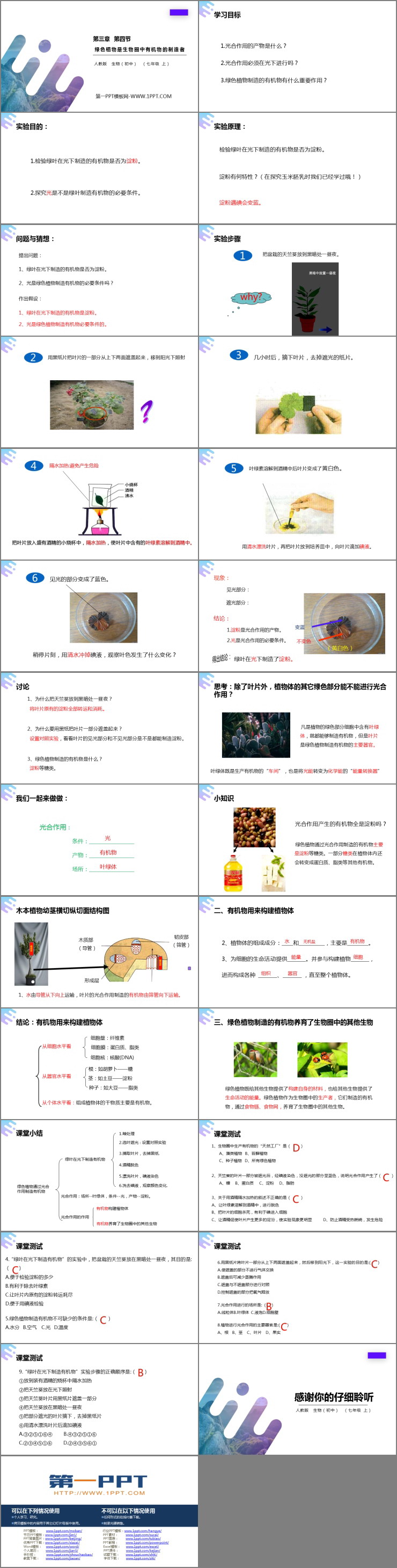 《绿色植物是生物圈中有机物的制造者》PPT精品课件包含学习目标、课堂实验、合作讨论、课堂小结、课堂测试等内容。
